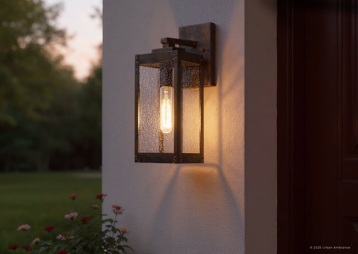 The UQL1632 draws attention with its elongated rectangular framework and seeded glass panels, a refined balance of modern farmhouse and transitional design. Unlike many outdoor sconces that rely on generic frosted glass, its beveled detailing and brass construction elevate both style and durability. Finished in a rich Bygone Bronze, it offers warmth and dimension while diffusing light in a soft, voluminous glow—creating a more architectural and artisanal presence than typical wall-mounted fixtures.