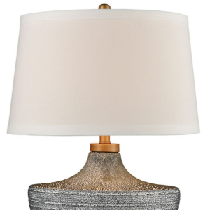 The Ankeny Collection table lamp is a striking statement of modern artistry, seamlessly blending bold contrasts and refined textures. Its sculpted ceramic base showcases a unique dual-tone finish, with a rich gold top that gracefully transitions into a deep charcoal texture below. This fusion of contemporary glamour and rustic charm creates a visually dynamic piece that adds depth and sophistication to any setting.