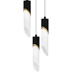 The Azusa Collection embodies sleek modernity with a sculptural, minimalist design that makes a bold statement. This pendant light features a striking asymmetrical frosted glass shade, elegantly curved to create a dynamic interplay of light and shadow. The matte black metal frame, accented with a subtle gold trim, enhances its contemporary aesthetic while adding a touch of warmth and sophistication.