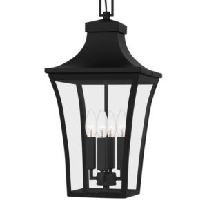 The Biloxi Collection captures the essence of classic outdoor lighting with a refined, traditional silhouette. This lantern-style pendant features a gracefully curved black metal frame, accented with clear glass panels that allow light to shine through brilliantly. The open, airy design showcases candelabra-style bulbs, creating a timeless and inviting ambiance for entryways, porches, and patios.