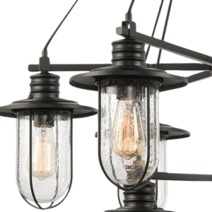 The nautical-inspired Boston collection effortlessly attracts a breezy coastal allure to indoor spaces. The sturdy design brilliantly highlights moderately sized hat-shaped shades married to the neatly affixed seedy glass diffusers.