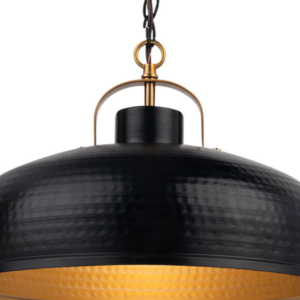 Crafted from steel, the Caria pendant light comes with an open bottom dome design that allows the bulb to be seen. The dome’s black finish exterior, chain, and canopy lend a sleek and sophisticated appeal, while the gold finish interior reflects the light beautifully, to create a warm and inviting ambiance. To attach the dome to the chain, gold metal appointments are used, complementing the golden dome interior while elegantly contrasting the fixture exterior. Shop all of the options available in the Caria Collection below.