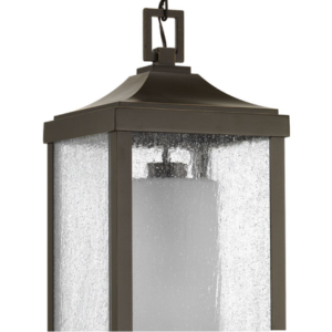 The aluminum framework showcases a stepped canopy cap that is replicated at the base in the same style. A rectangular framework sits between the surrounding clear seedy glass panes. Further into the design sits an etched cylinder shade that appears to be the light source, creating an intriguing diffusion. Shop all of the options available in the Catania Collection below.