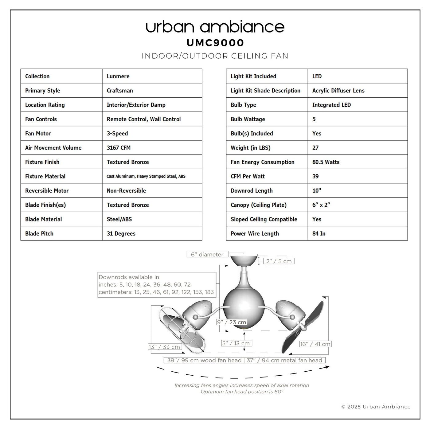 UMC9000 Craftsman Indoor/Outdoor Ceiling Fan, 16" (Plus Downrod) H x 37" W x 37" D, Textured Bronze Finish, Lunmere Collection