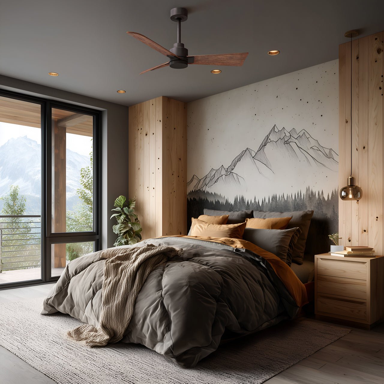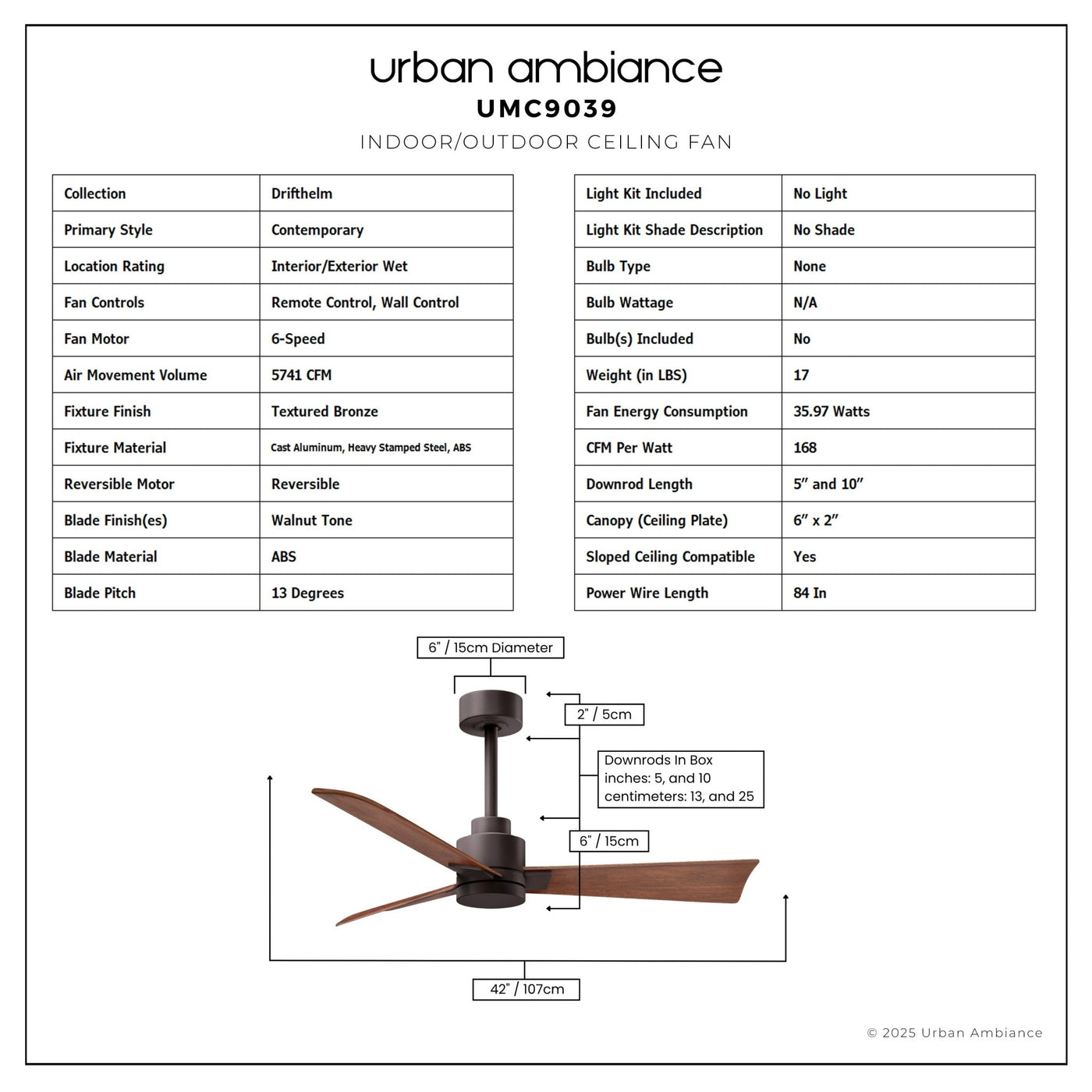 UMC9039 Contemporary Indoor/Outdoor Ceiling Fan, 8" (Plus Downrod) H x 42" W x 42" D, Textured Bronze Finish, Drifthelm Collection