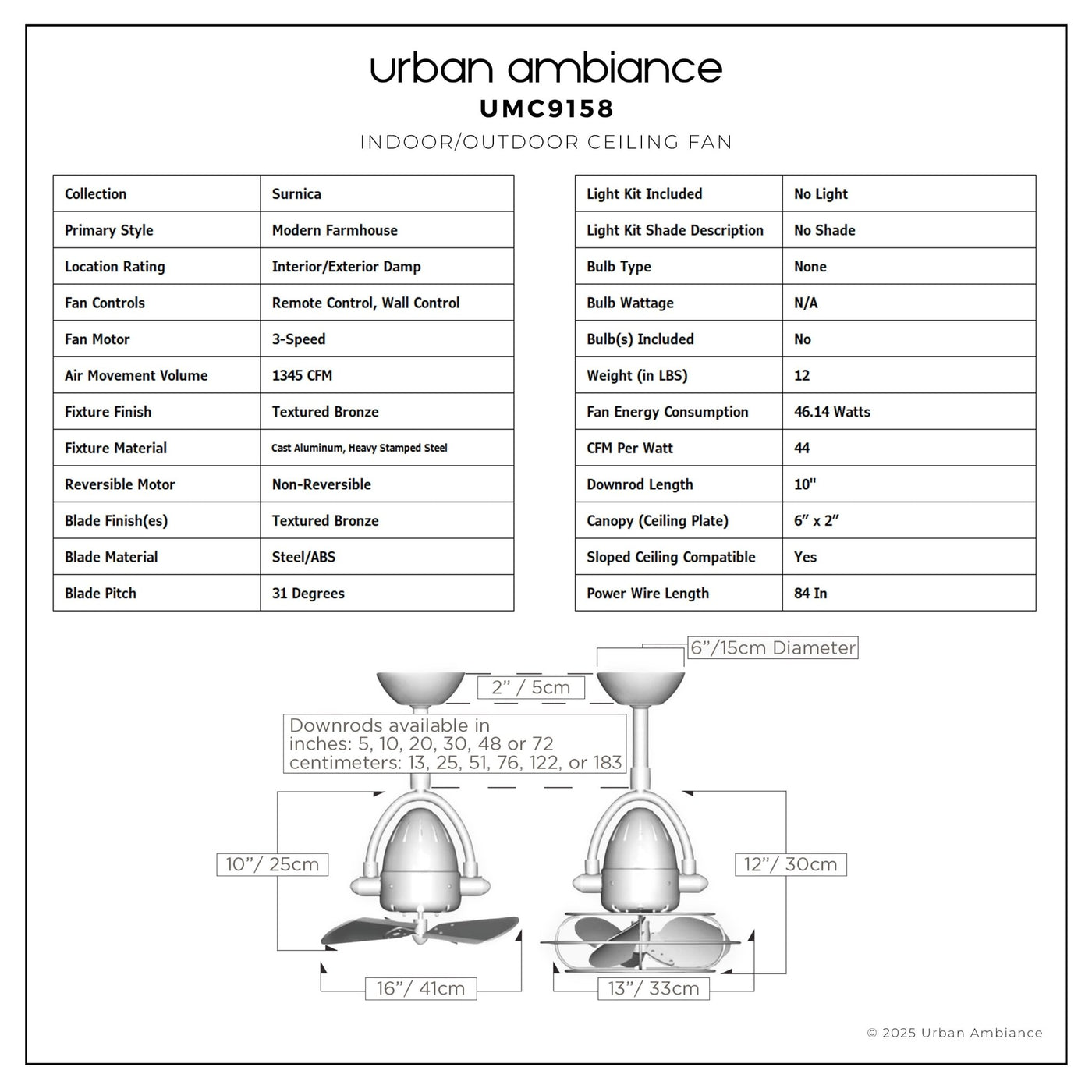 UMC9158 Modern Farmhouse Indoor/Outdoor Ceiling Fan, 14" (Plus Downrod) H x 13" W x 13" D, Textured Bronze Finish, Surnica Collection