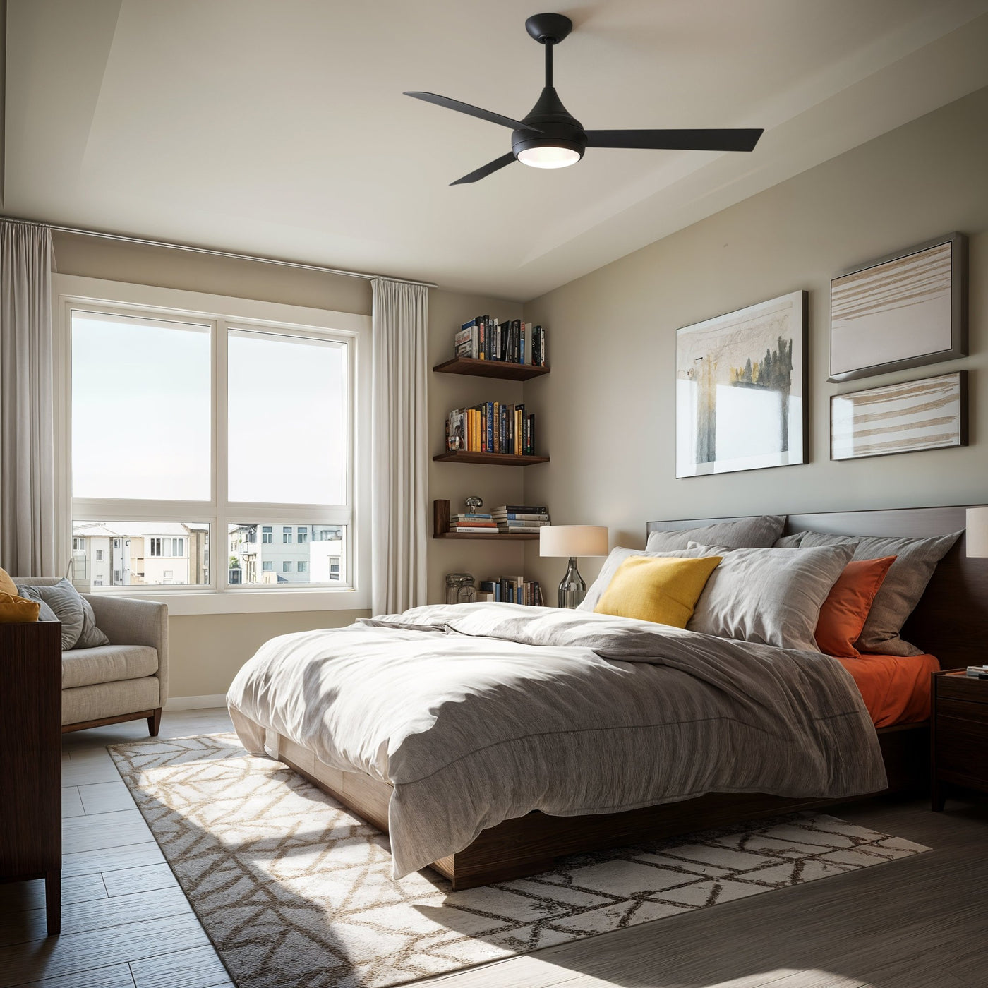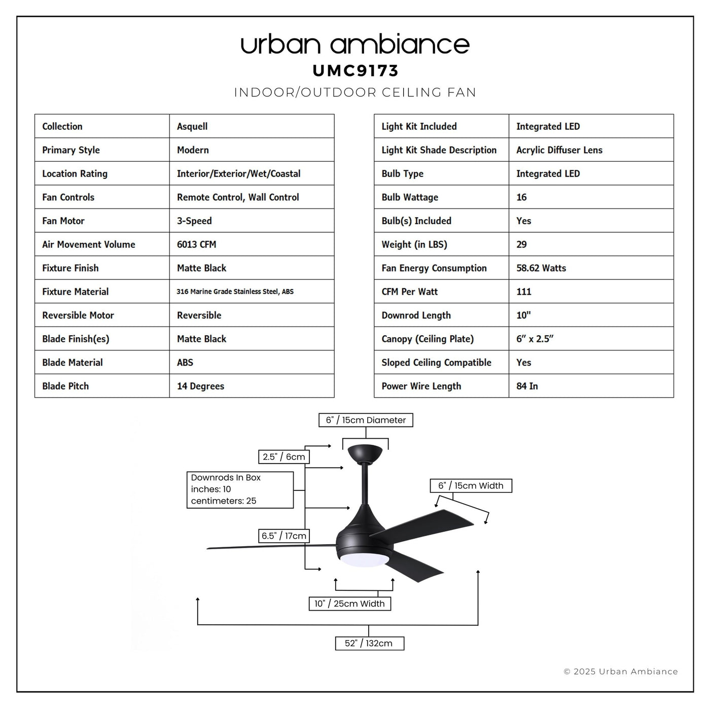 UMC9173 Modern Indoor/Outdoor Ceiling Fan, 9" (Plus Downrod) H x 52" W x 52" D, Matte Black Finish, Asquell Collection