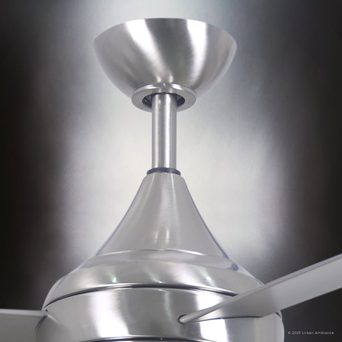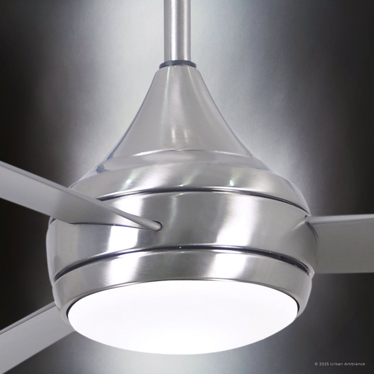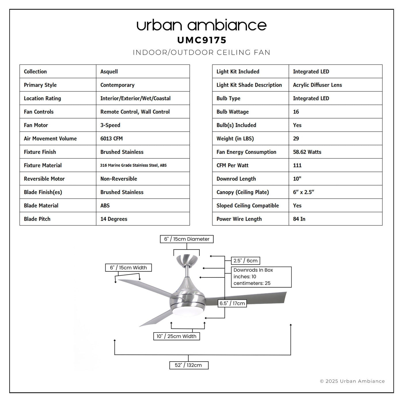 UMC9175 Contemporary Indoor/Outdoor Ceiling Fan, 9" (Plus Downrod) H x 52" W x 52" D, Brushed Stainless Finish, Asquell Collection