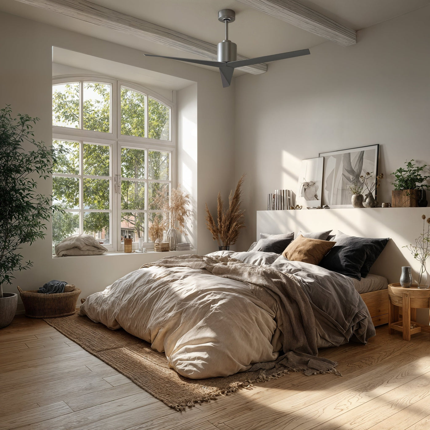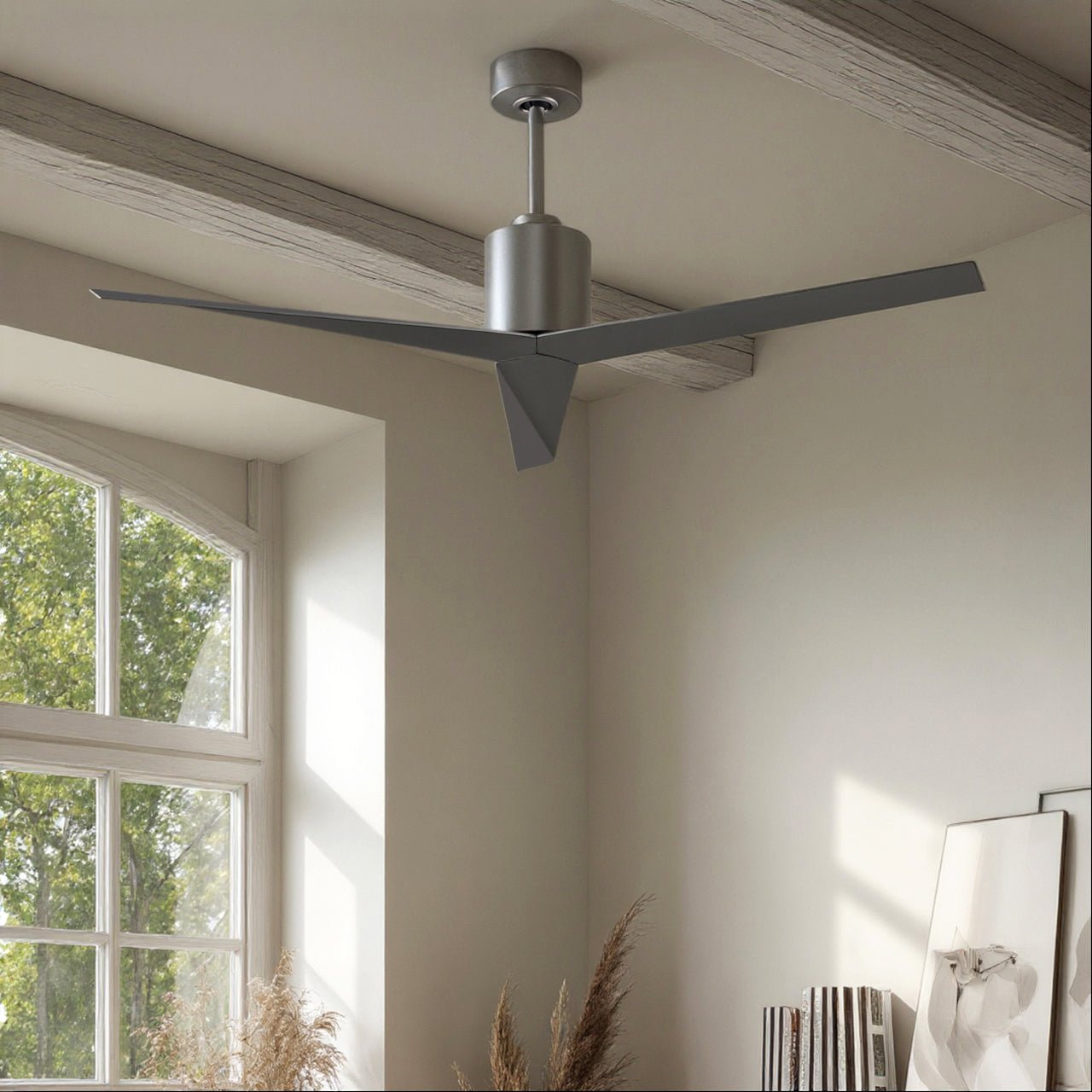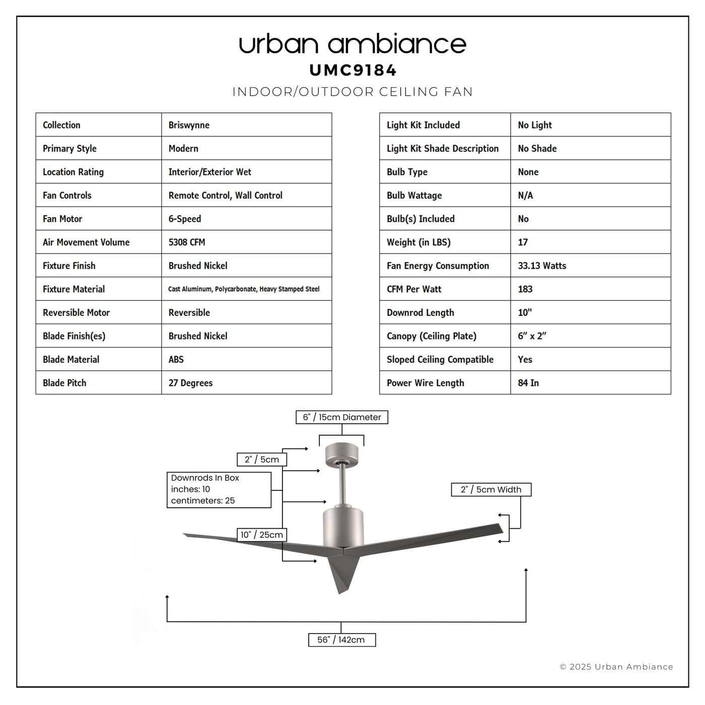 UMC9184 Modern Indoor/Outdoor Ceiling Fan, 12" (Plus Downrod) H x 56" W x 56" D, Brushed Nickel Finish, Briswynne Collection