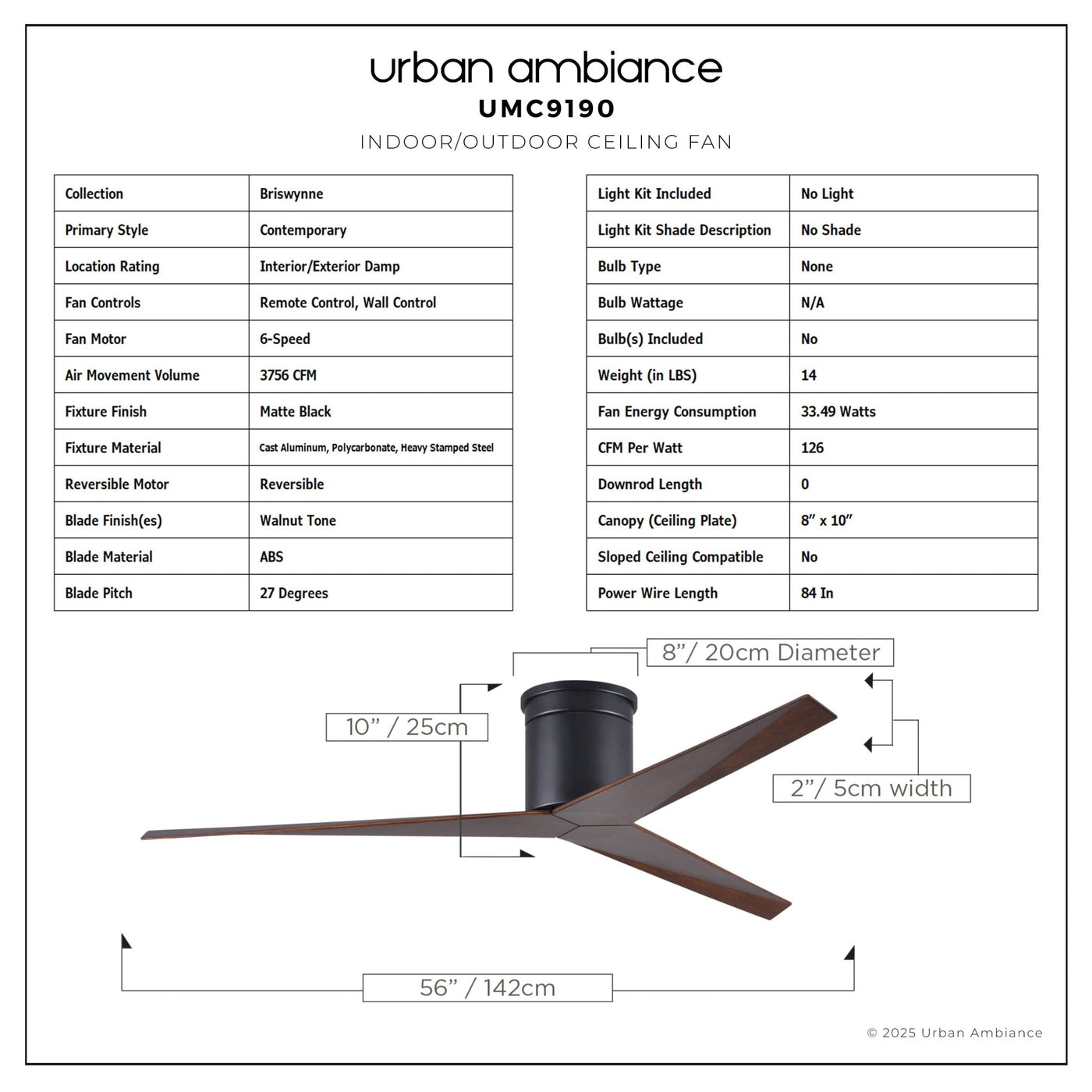 UMC9190 Contemporary Indoor/Outdoor Ceiling Fan, 10" H x 56" W x 56" D, Matte Black Finish, Briswynne Collection