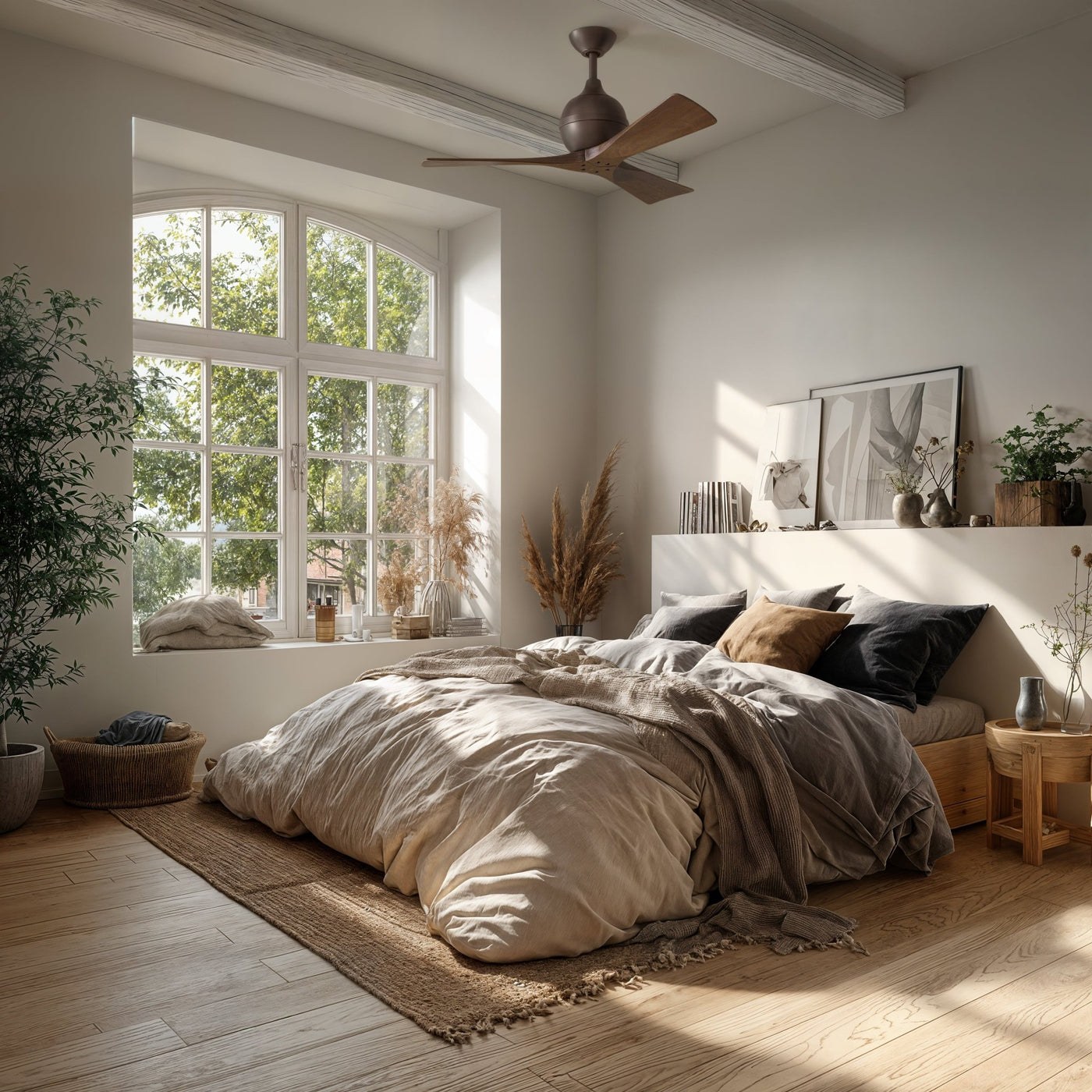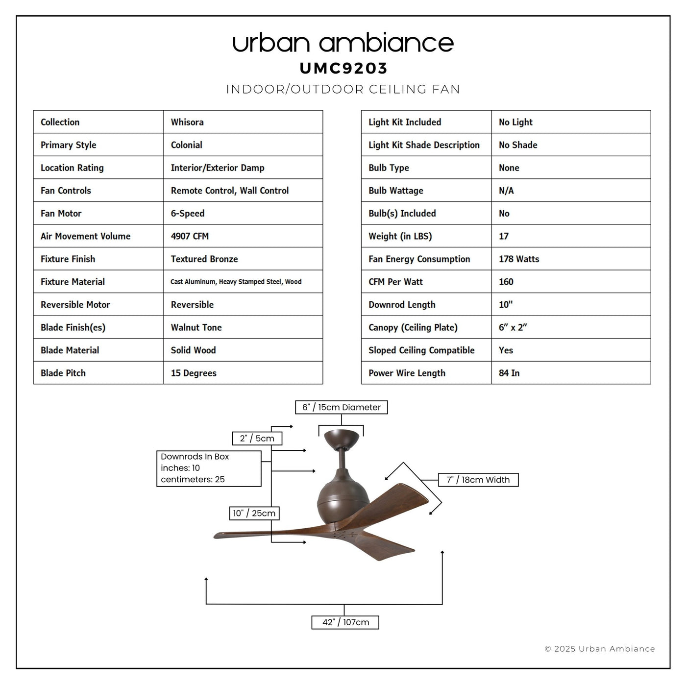 UMC9203 Colonial Indoor/Outdoor Ceiling Fan, 12" (Plus Downrod) H x 42" W x 42" D, Textured Bronze Finish, Whisora Collection