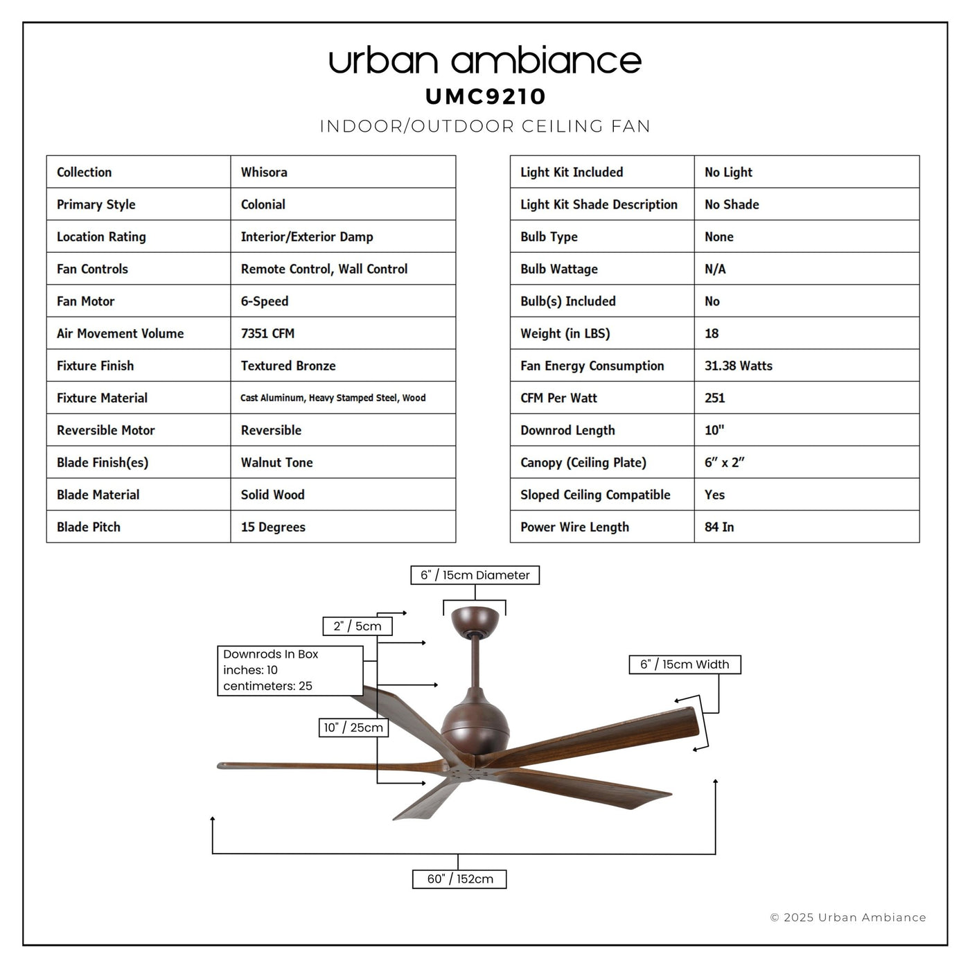 UMC9210 Colonial Indoor/Outdoor Ceiling Fan, 12" (Plus Downrod) H x 60" W x 60" D, Textured Bronze Finish, Whisora Collection