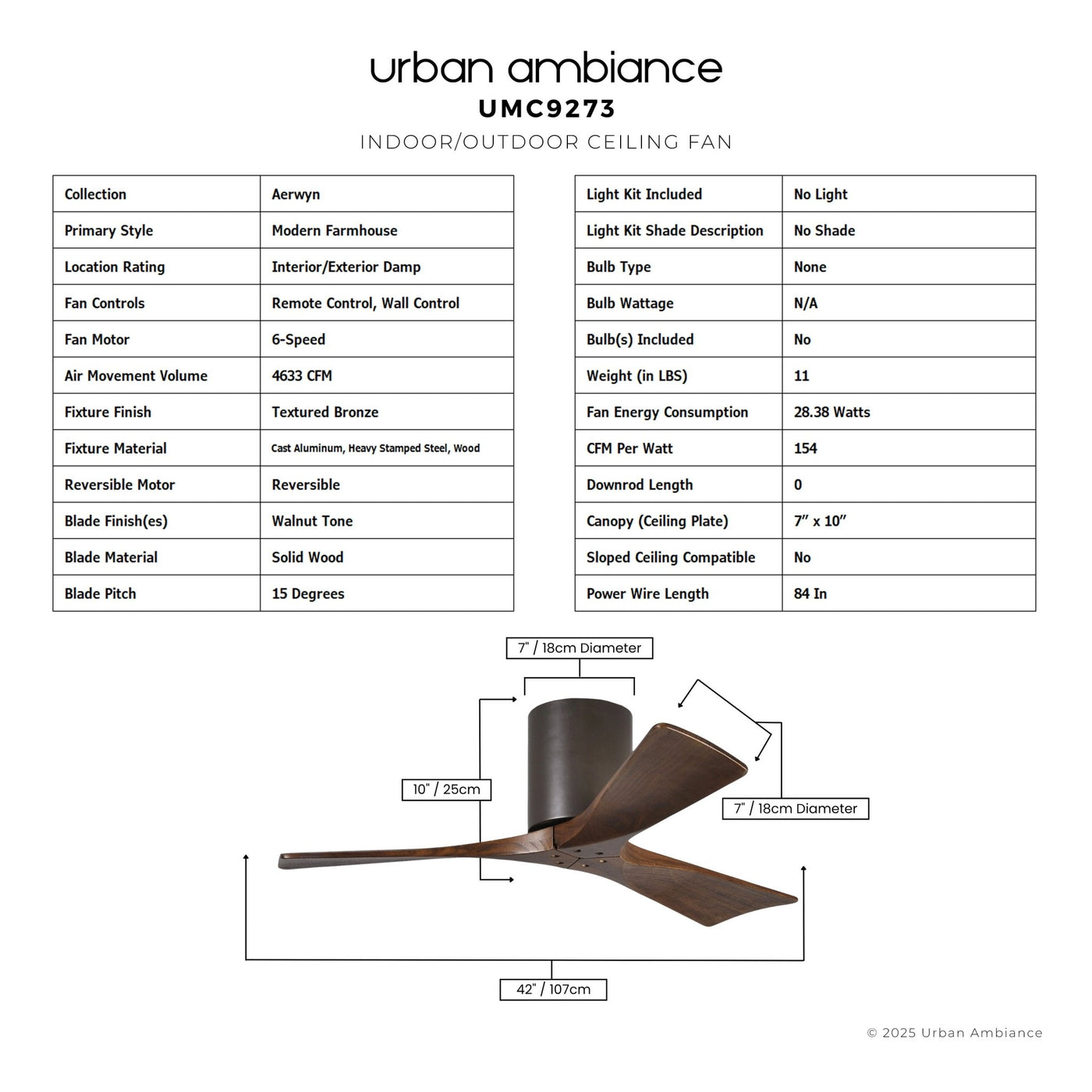 UMC9273 Modern Farmhouse Indoor/Outdoor Ceiling Fan, 10" H x 42" W x 42" D, Textured Bronze Finish, Aerwyn Collection