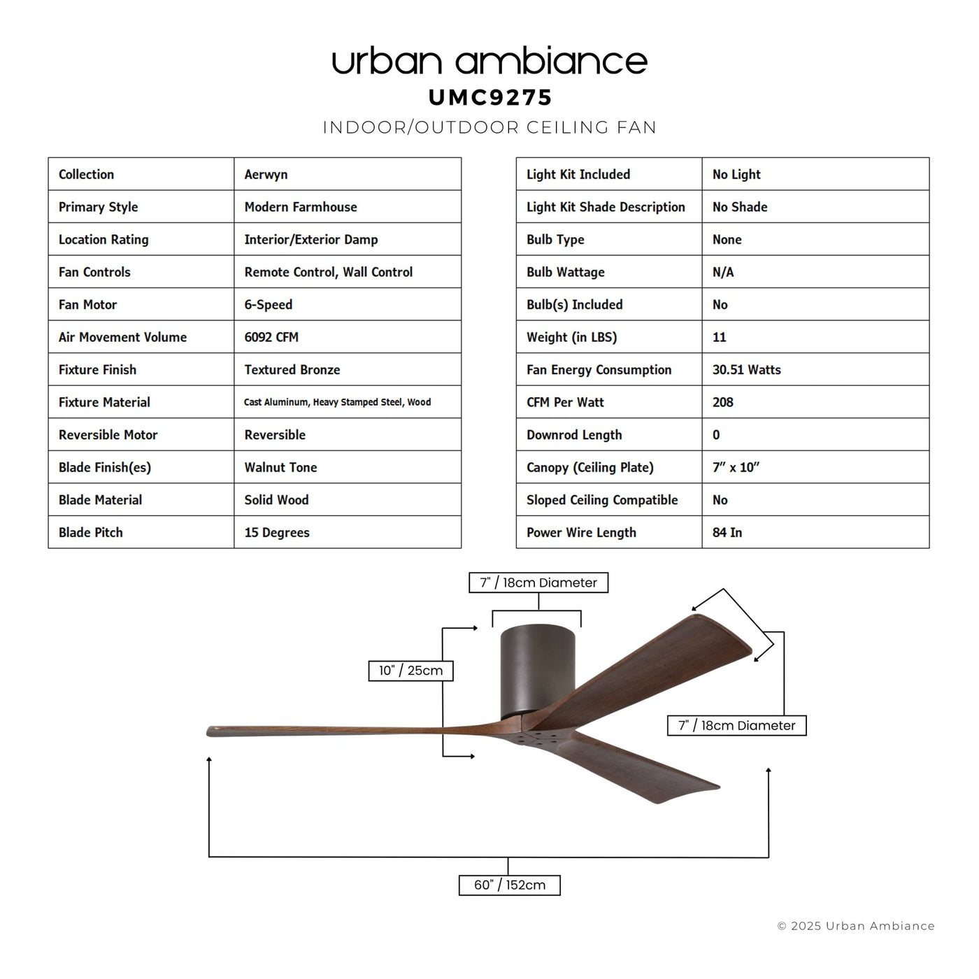 UMC9275 Modern Farmhouse Indoor/Outdoor Ceiling Fan, 10" H x 60" W x 60" D, Textured Bronze Finish, Aerwyn Collection