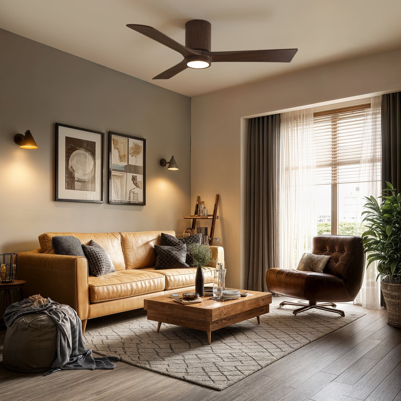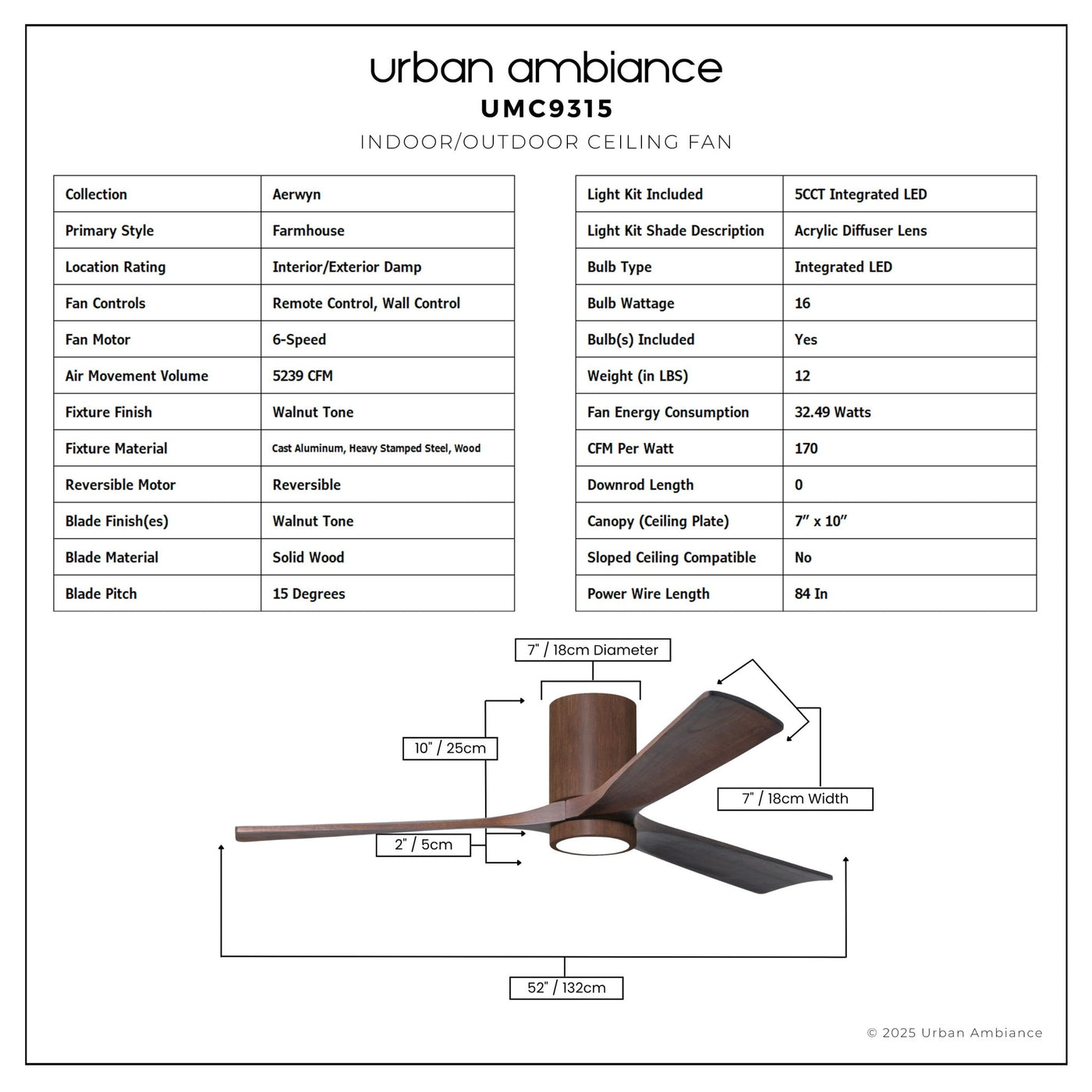 UMC9315 Farmhouse Indoor/Outdoor Ceiling Fan, 12" H x 52" W x 52" D, Walnut Tone Finish, Aerwyn Collection