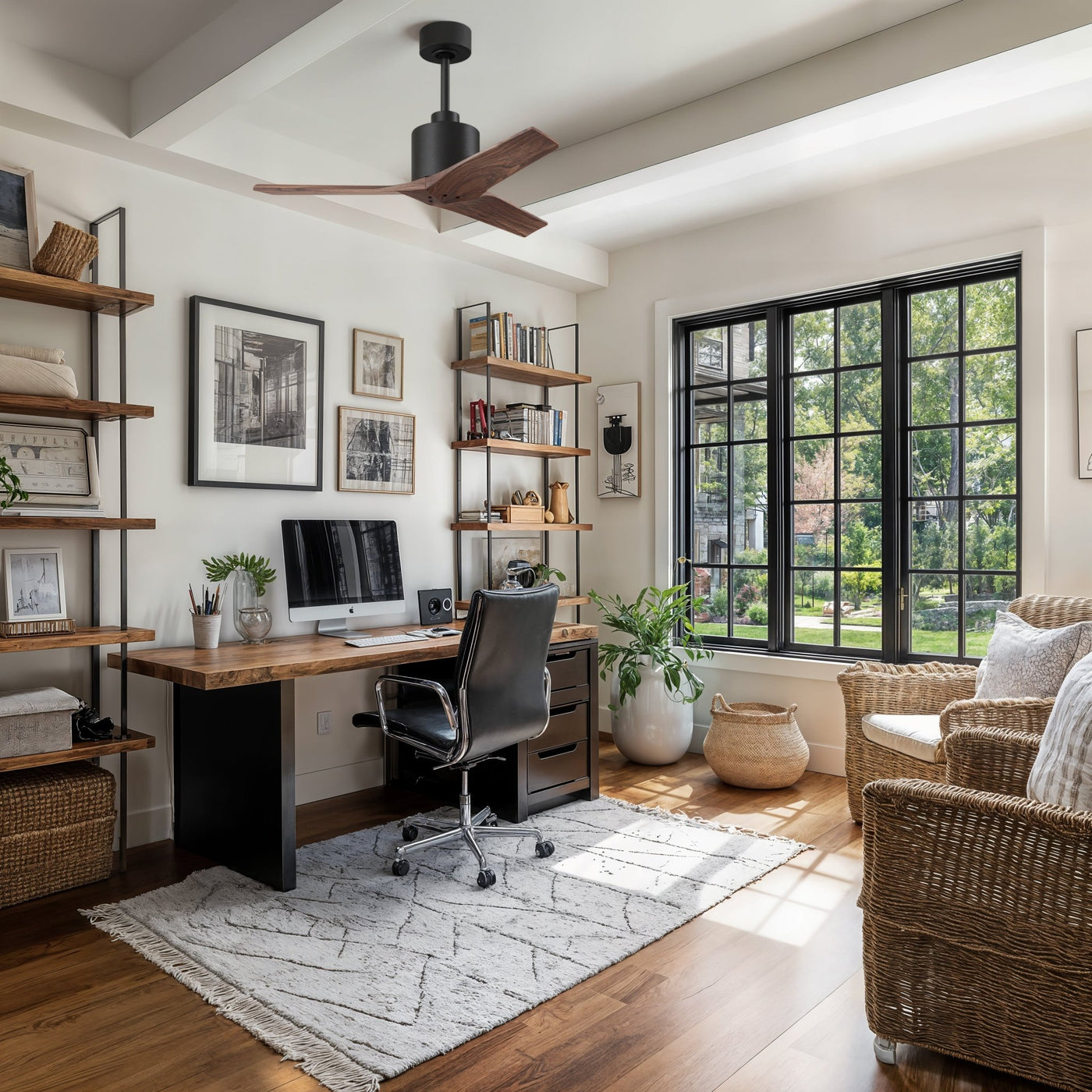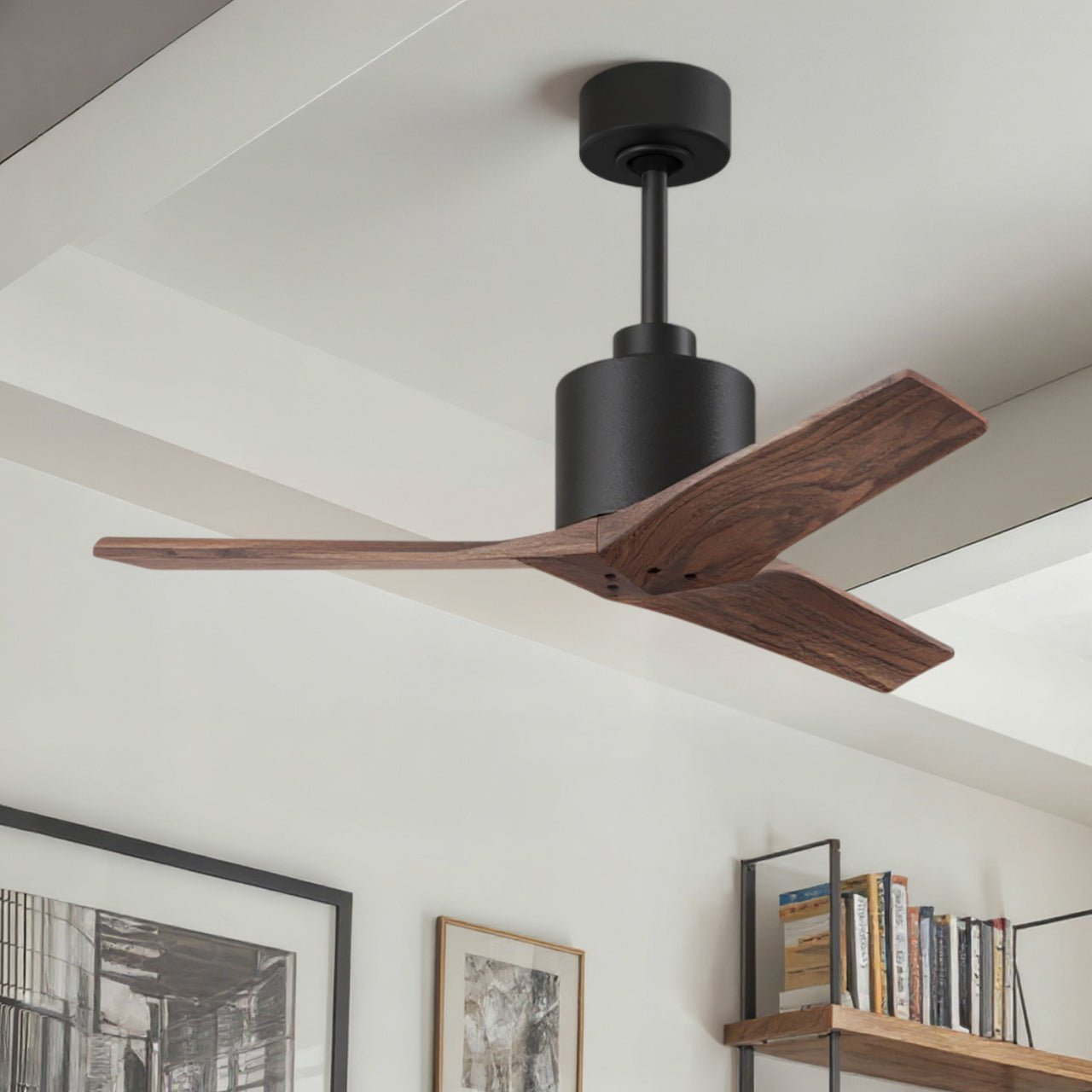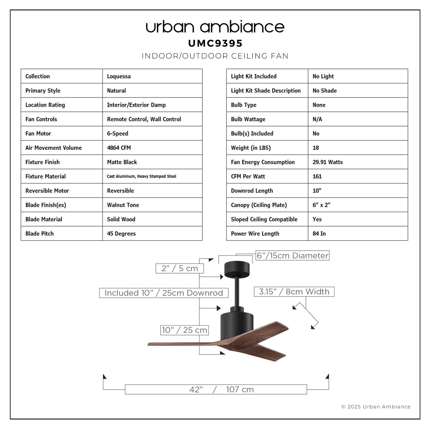 UMC9395 Natural Indoor/Outdoor Ceiling Fan, 12" (Plus Downrod) H x 42" W x 42" D, Matte Black Finish, Loquessa Collection