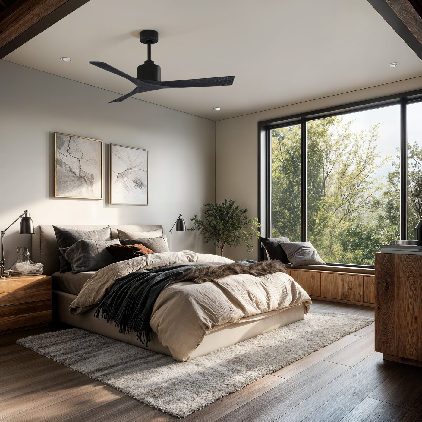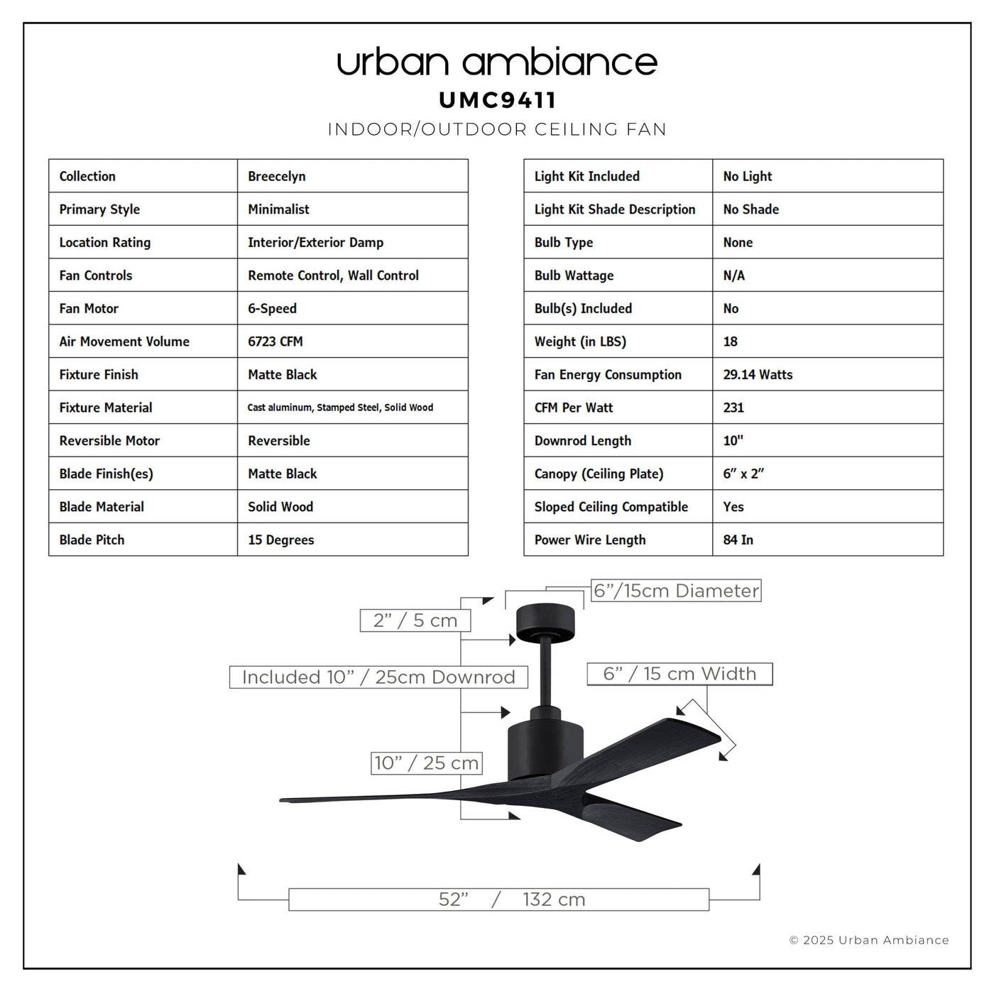 UMC9411 Minimalist Indoor/Outdoor Ceiling Fan, 12" (Plus Downrod) H x 52" W x 52" D, Matte Black Finish, Breecelyn Collection