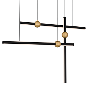 The Ceres Collection embraces avant-garde design with a striking balance of geometry and modern minimalism. This sculptural chandelier features an asymmetrical arrangement of sleek black metal rods, suspended at varying heights to create a dynamic, architectural statement. Warm gold spheres serve as accent points, adding a touch of contrast and elegance while providing soft, diffused lighting that enhances the ambiance of contemporary spaces.