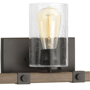 The square bar features a wood stain to create charming vintage contrast. The bar is suspended through a set of dark-toned metallic brackets to add distinction, and the protruding nuts add to the beauty of the accented bar. Partially encasing the oversized socket sleeve is a clear seeded glass cylinder, adding a subtle layered illusion to the view. An oversized vintage bulb nearly obscures the shade when it begins to emit a warm glow.