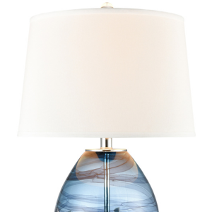 The Decorah Collection is a stunning fusion of artistry and elegance, drawing inspiration from the beauty of natural landscapes. This table lamp showcases a hand-blown glass base with swirling hues of blue, amber, and white, creating a mesmerizing, one-of-a-kind design. The organic movement of colors mimics flowing water and sunlit skies, adding depth and visual intrigue to any space.