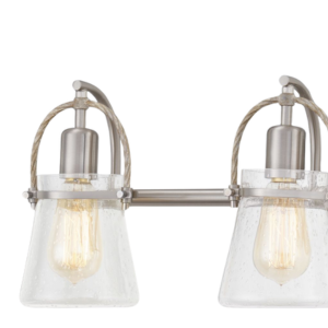 The Dresden indoor bath light is a unique and charming fixture that combines modern and rustic elements. It features a circular backplate made of brushed nickel that mounts securely to the wall and anchors a horizontal bar that extends horizontally to support the light shades. The fixture includes two, three, or four light holders, each designed to hold an exposed Edison-style bulb. These bulbs emit a warm, inviting glow, enhancing the rustic charm of the fixture.