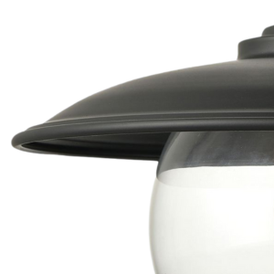 The sturdy build features an extra-long pipe elbow attaching to the mount location, serenely suspending the oversized steel shade. Firmly linking the arm to the shade canopy is a pawn-shaped pillar smoothly slanting downward. The stunning shade is a flat bottom flask-shaped clear glass that engulfs the bulb socket. The illusion of the glass base creates the impression of a falling light bulb.