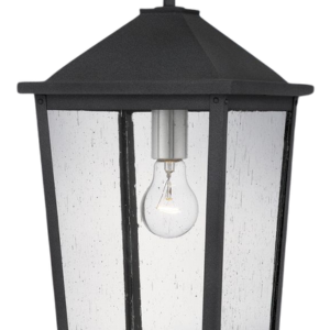 The lanterns come encased with seeded glass panels that create a slightly textured look. The seeded glass not only adds visual interest but also diffuses light to reduce glare. Within the enclosure, there’s a single bulb with an exposed filament, suggesting an Edison-style LED bulb designed to replicate the vintage look of incandescent lighting.