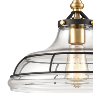At the base, the stem sprawls into a smooth-flowing descent highlighting a curved clear glass resembling an inverted glass bowl. Partially surrounding the stepped glass shade is a skillfully infused metal wirework making a fractional wire cage. The stepped descent at the bottom of the glass creates an attractive illusion of a layered light bulb with varied levels of diffusion.
