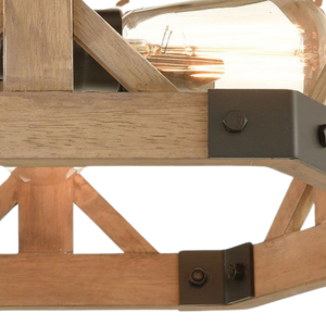 The design incorporates a well-balanced distribution of solid wood and accenting metal hardware to induce an architectural rustic appeal indoors. Both the top and base wooden support take a hexagonal shape decoratively intertwined with orderly spaced wood framing. At the angled edges of the wood, small angled metal plates are screwed into place by peeking nuts and bolts. The partly revealed bulb adds to the elegant detail.