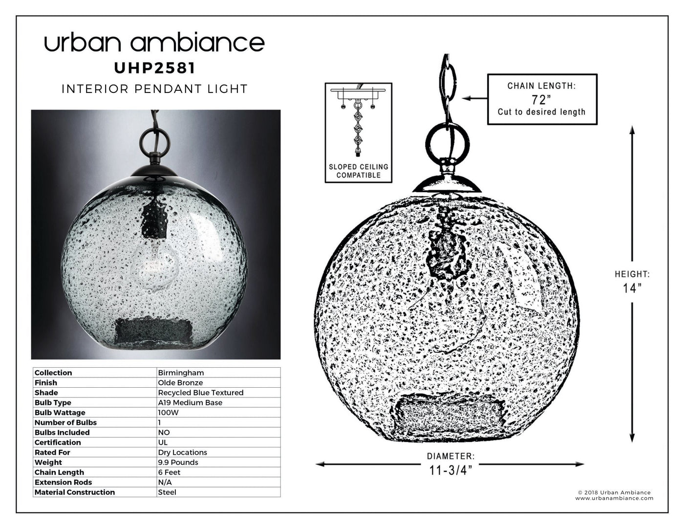 UHP2581 Vintage Pendant, 14"H x 11-3/4"W, Olde Bronze Finish, Birmingham Collection