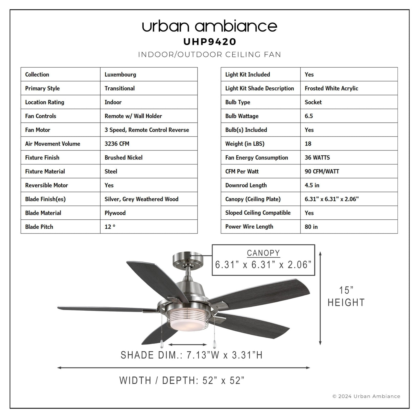 UHP9420 Transitional Indoor Ceiling Fan, 15''H x 52"W x 52''D, Brushed Nickel Finish, Luxembourg Collection