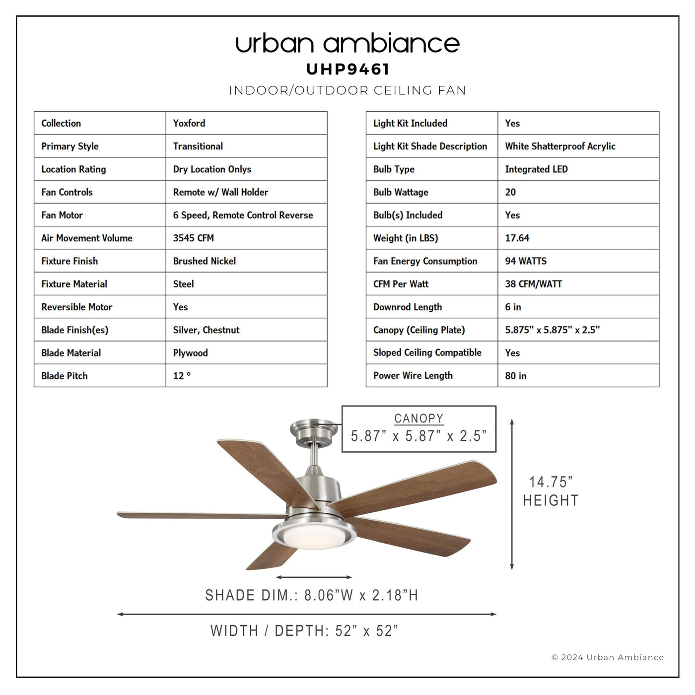 UHP9461 New Traditional Indoor Ceiling Fan, 14-3/4''H x 52"W x 52''D, Brushed Nickel Finish, Yoxford Collection