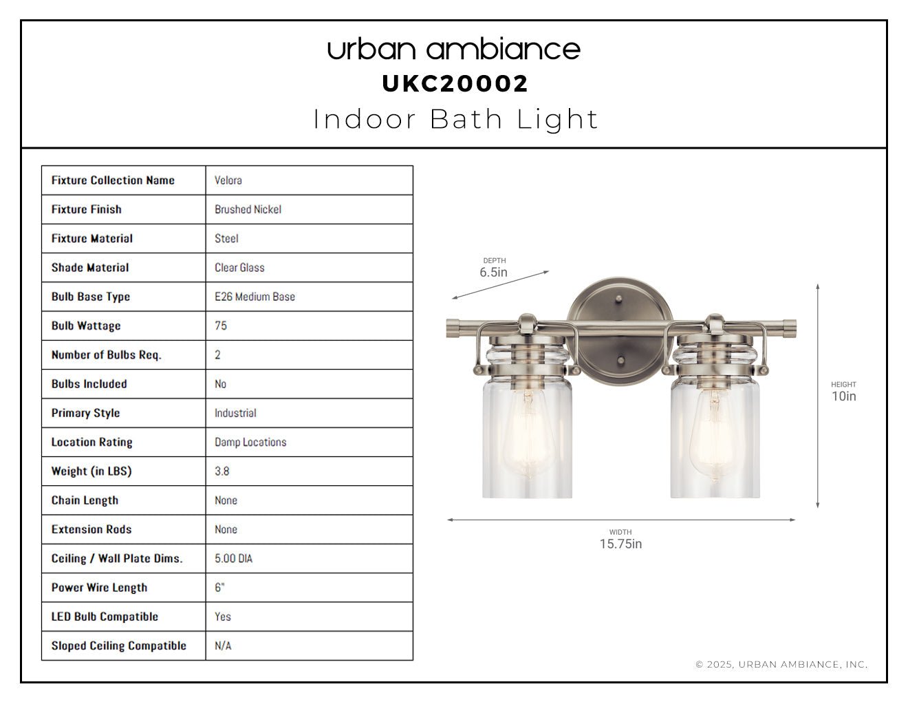 UKC20002 Industrial Indoor Bath Light, 10''H x 15.75''W x 6.75''Dep, Brushed Nickel Finish, Velora Collection