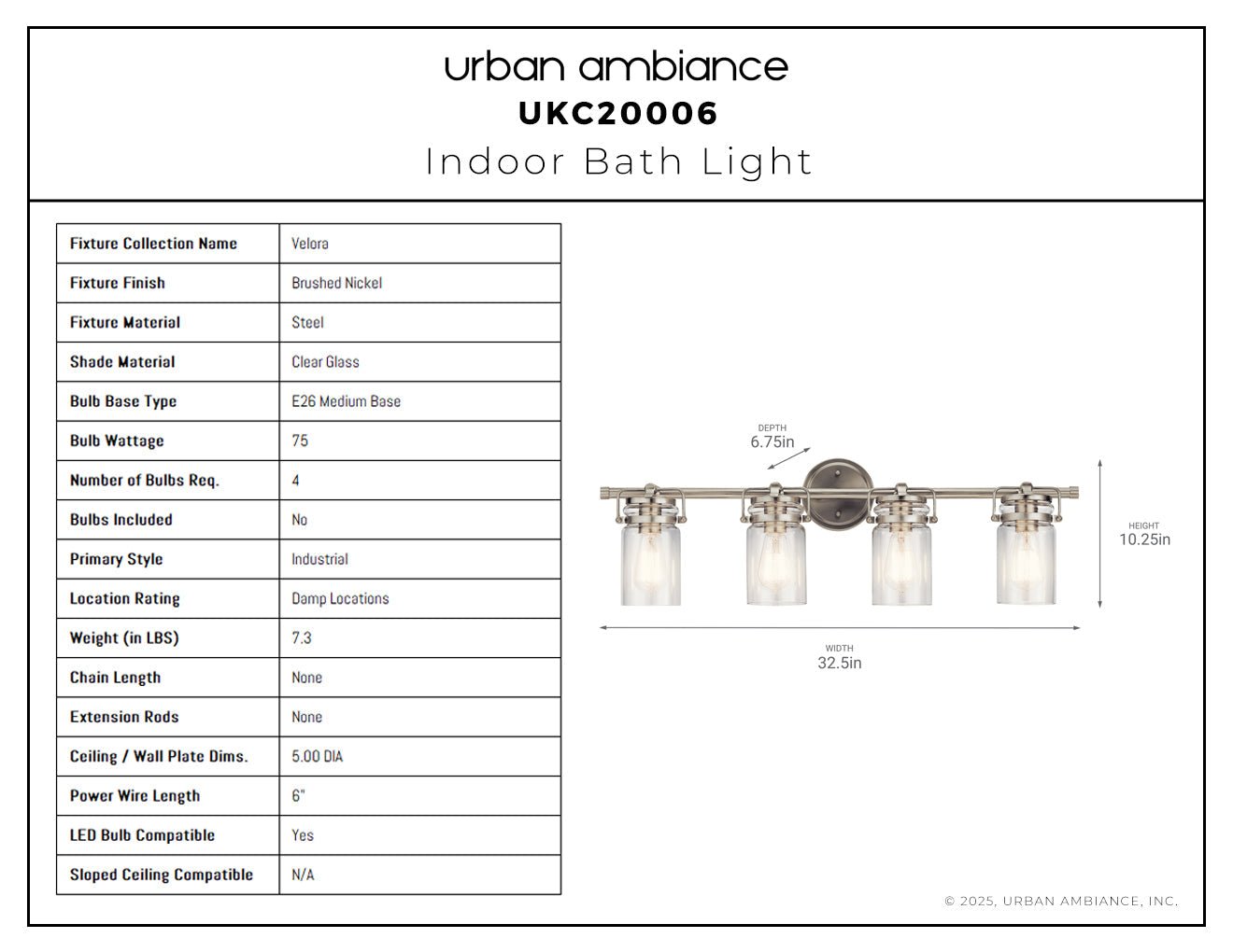 UKC20006 Industrial Indoor Bath Light, 10.25''H x 32.5''W x 6.75''Dep, Brushed Nickel Finish, Velora Collection