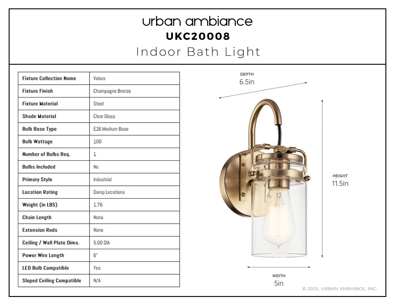 UKC20008 Industrial Indoor Bath Light, 11.5''H x 5''W x 6.5''Dep, Champagne Bronze Finish, Velora Collection