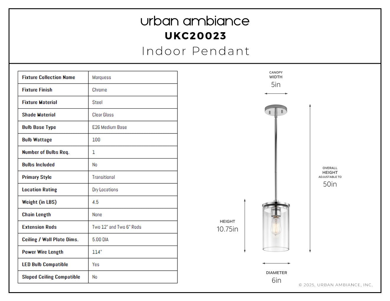 UKC20023 Transitional Indoor Pendant, 10.75''H x 6''W x 6''Dep, Chrome Finish, Marquess Collection