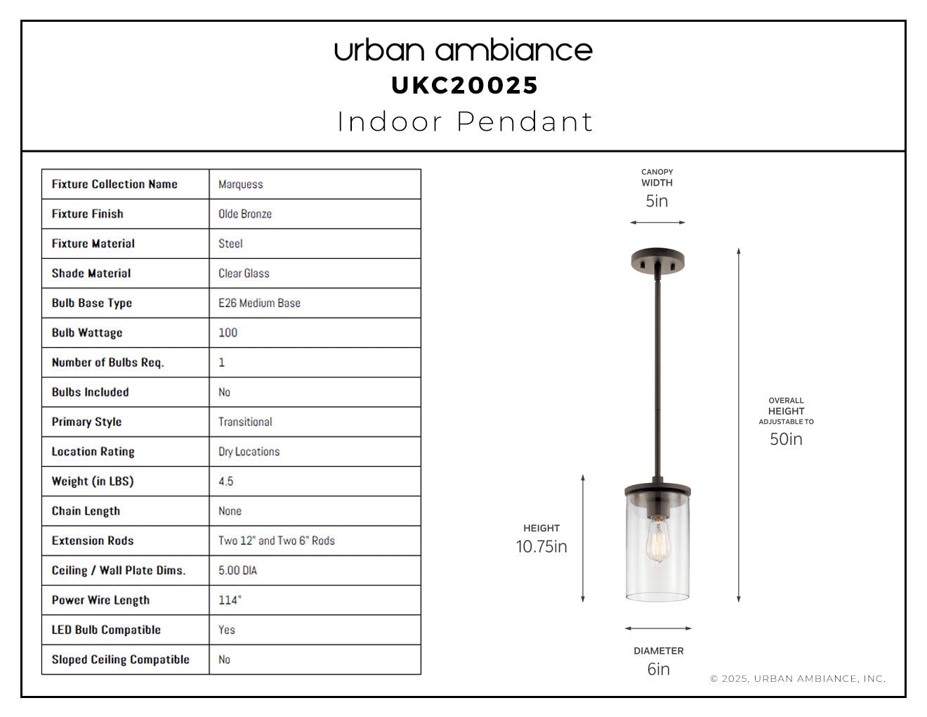 UKC20025 Transitional Indoor Pendant, 10.75''H x 6''W x 6''Dep, Olde Bronze Finish, Marquess Collection