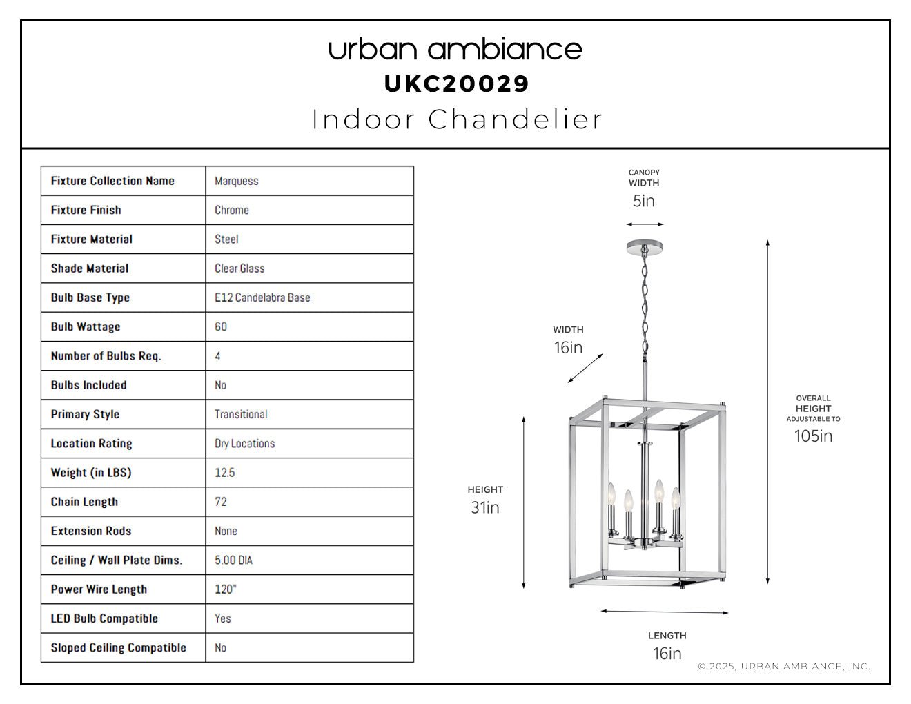 UKC20029 Transitional Indoor Chandelier, 31''H x 16''W x 16''Dep, Chrome Finish, Marquess Collection
