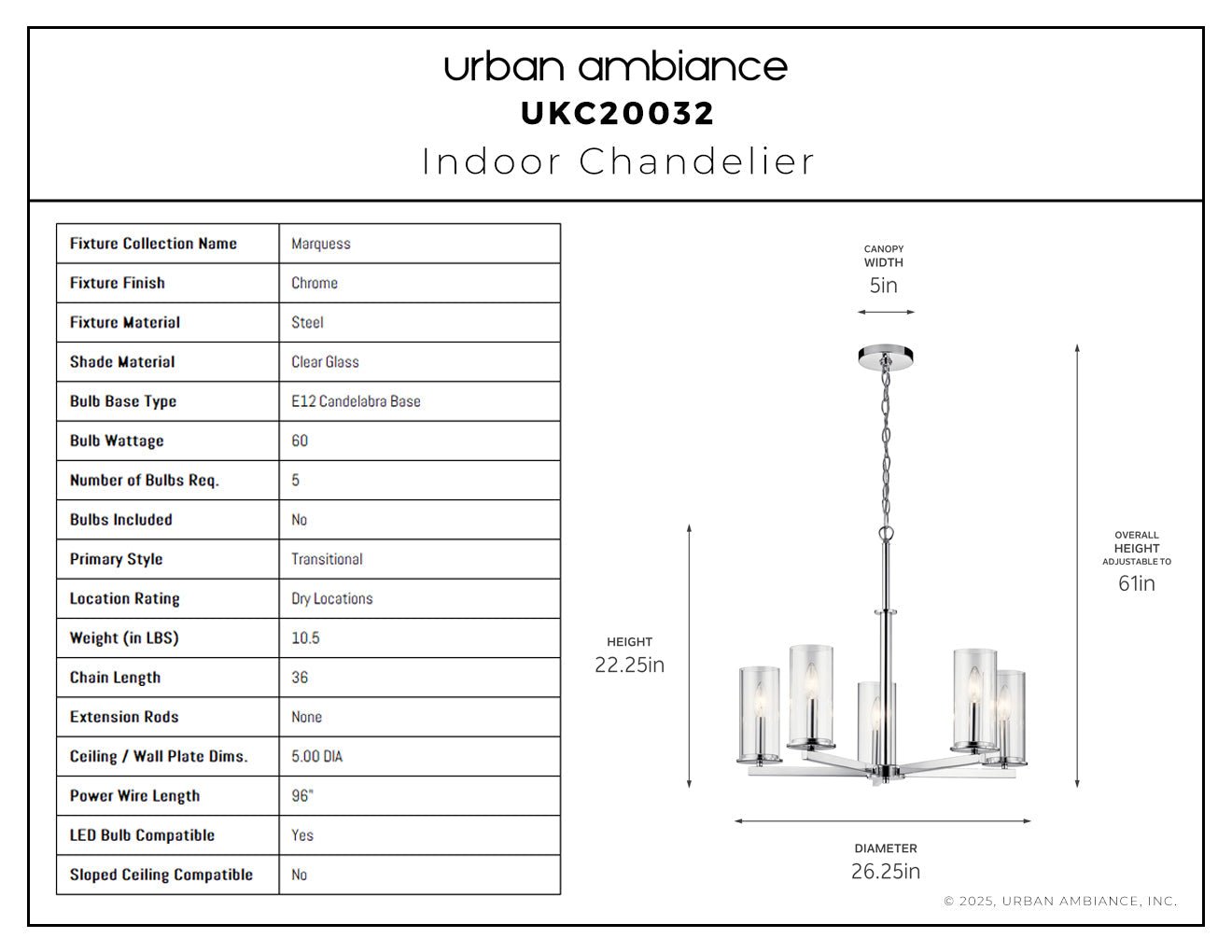 UKC20032 Transitional Indoor Chandelier, 22.25''H x 26.25''W x 26.25''Dep, Chrome Finish, Marquess Collection