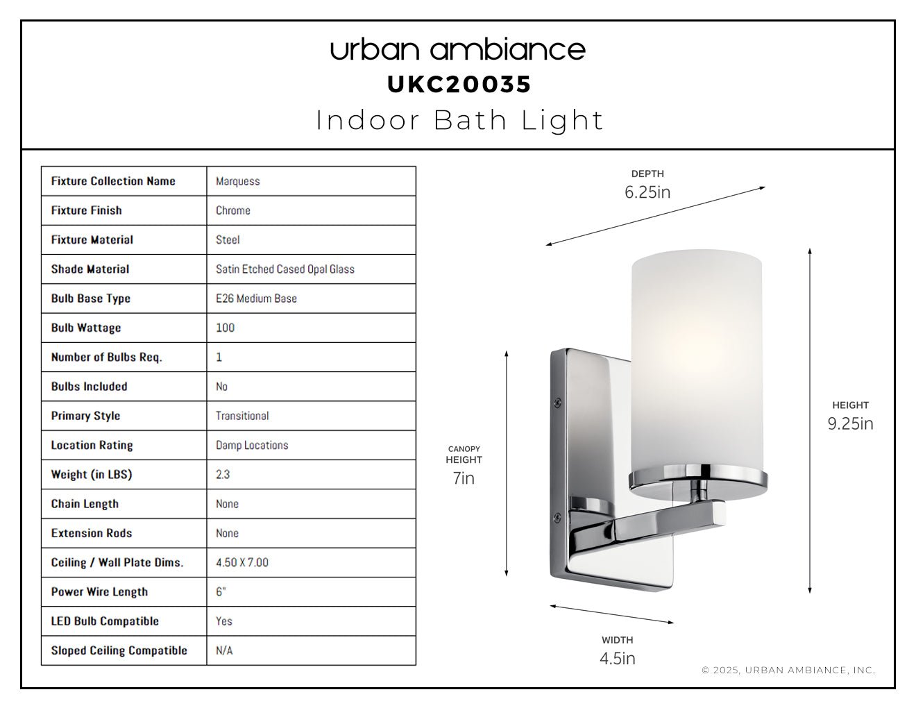 UKC20035 Transitional Indoor Bath Light, 9.25''H x 4.5''W x 6.25''Dep, Chrome Finish, Marquess Collection