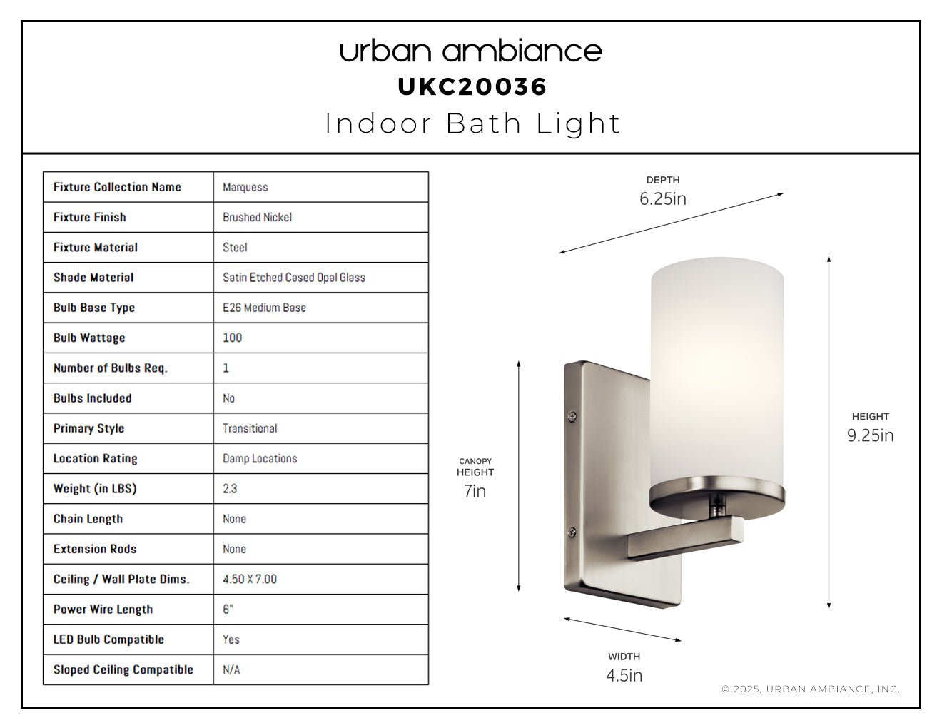 UKC20036 Transitional Indoor Bath Light, 9.25''H x 4.5''W x 6.25''Dep, Brushed Nickel Finish, Marquess Collection
