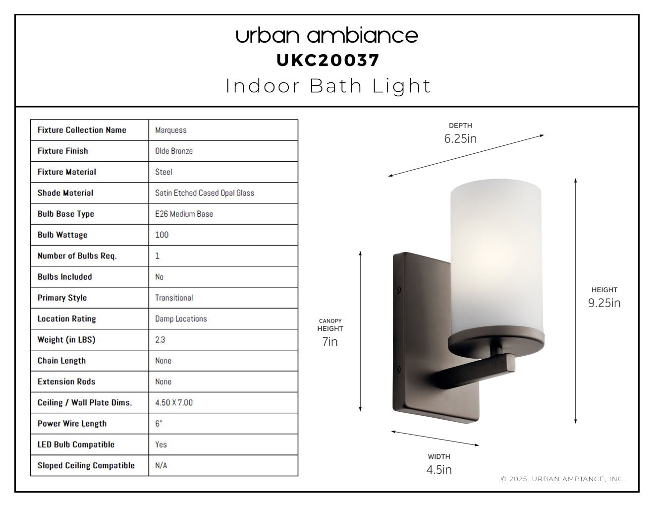 UKC20037 Transitional Indoor Bath Light, 9.25''H x 4.5''W x 6.25''Dep, Olde Bronze Finish, Marquess Collection