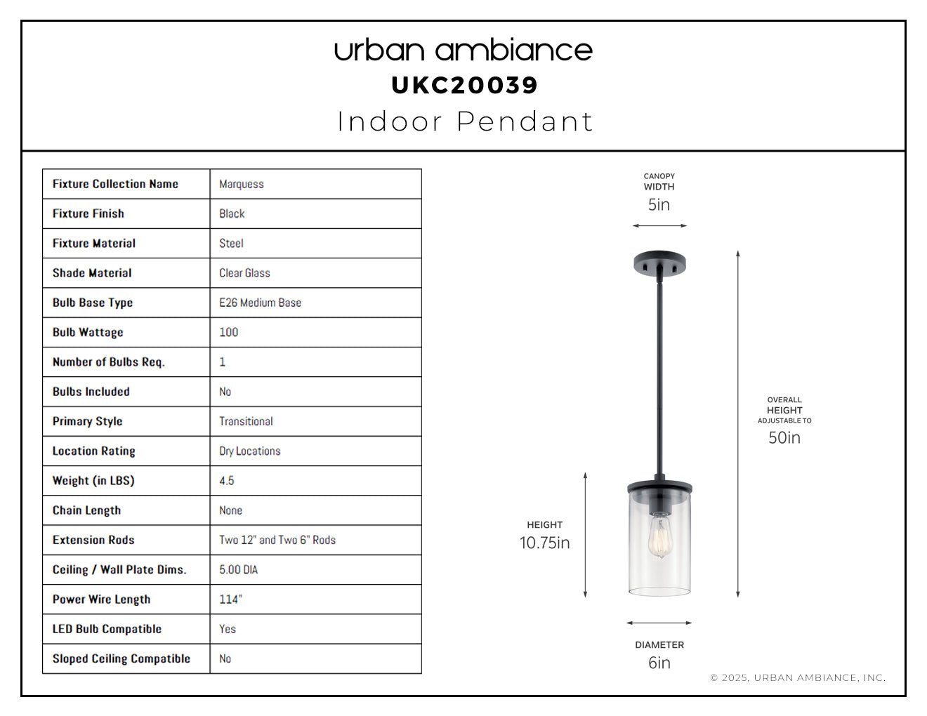 UKC20039 Transitional Indoor Pendant, 10.75''H x 6''W x 6''Dep, Black Finish, Marquess Collection