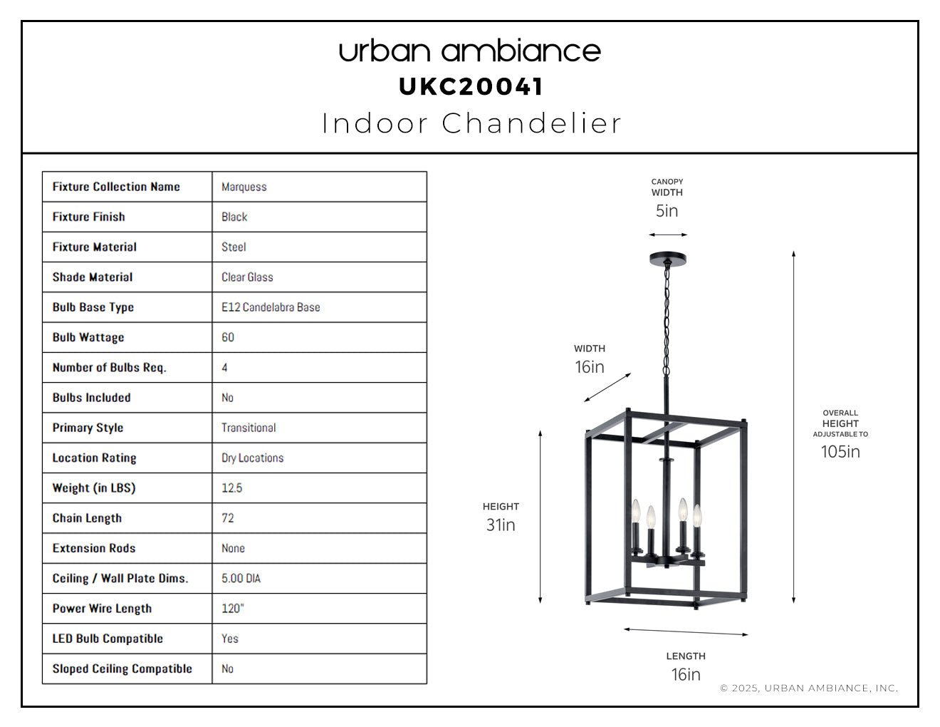 UKC20041 Transitional Indoor Chandelier, 31''H x 16''W x 16''Dep, Black Finish, Marquess Collection