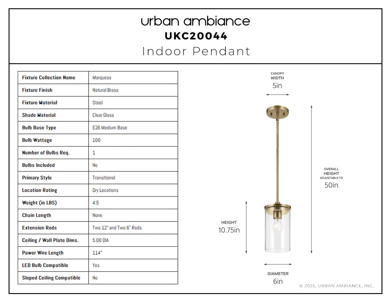 UKC20044 Transitional Indoor Pendant, 10.75''H x 6''W x 6''Dep, Natural Brass Finish, Marquess Collection