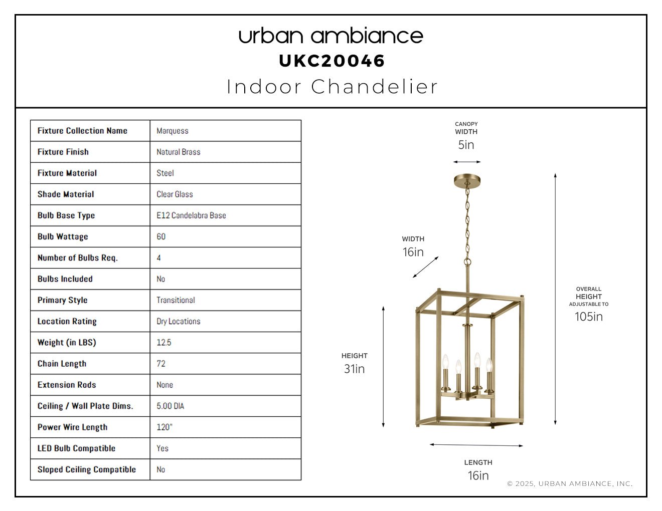 UKC20046 Transitional Indoor Chandelier, 31''H x 16''W x 16''Dep, Natural Brass Finish, Marquess Collection