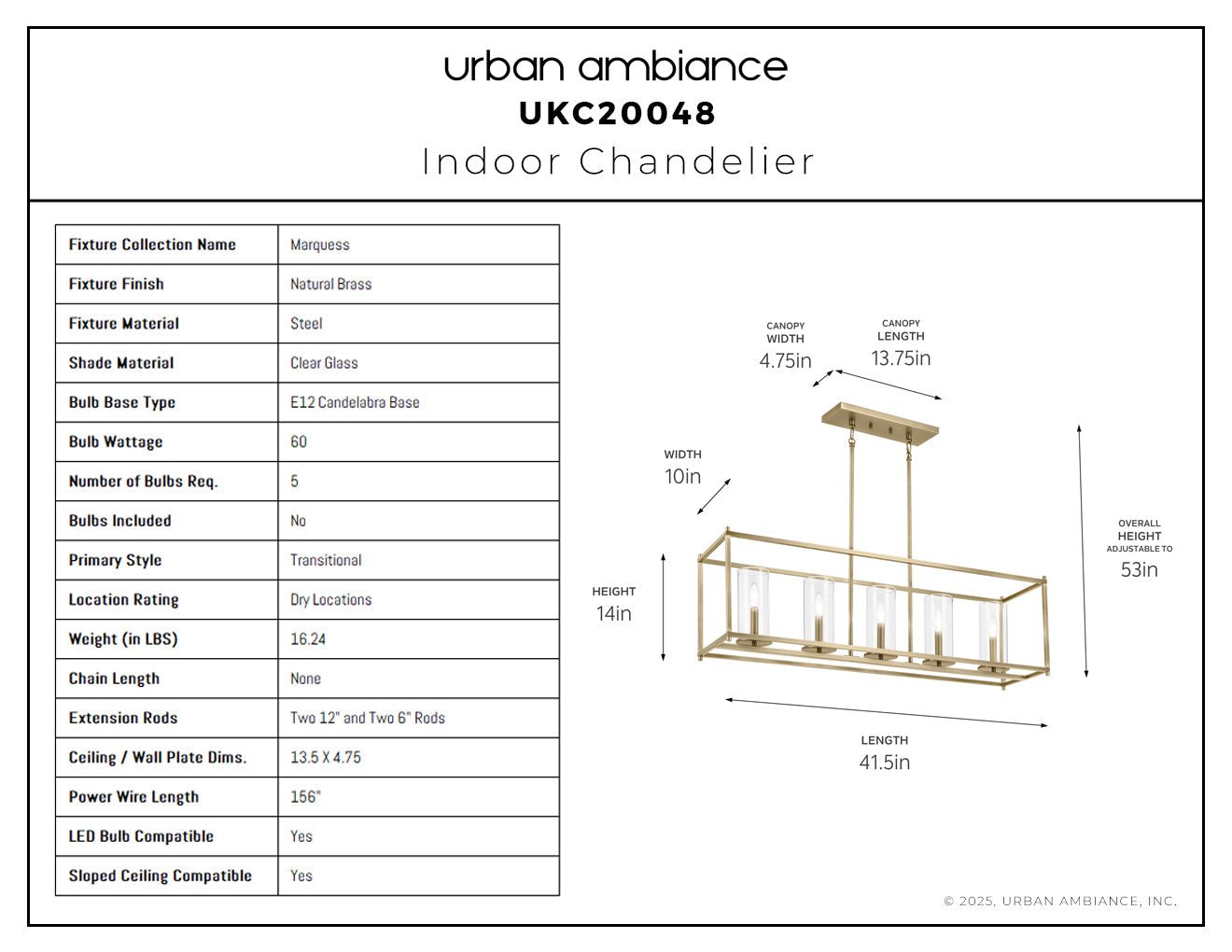 UKC20048 Transitional Indoor Chandelier, 13.5''H x 41.5''W x 10''Dep, Natural Brass Finish, Marquess Collection