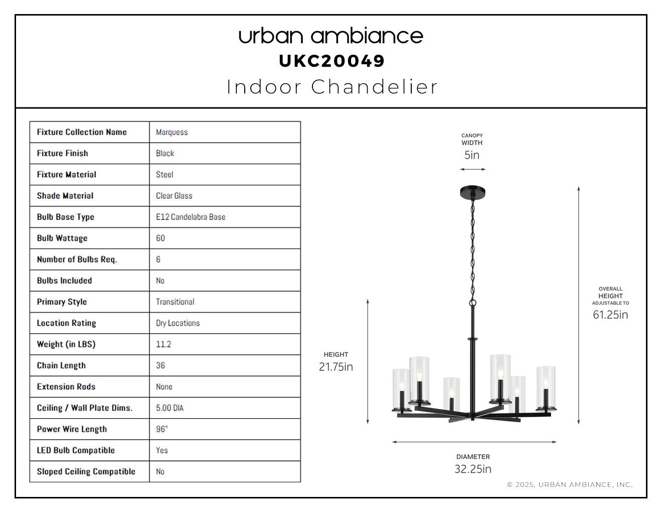 UKC20049 Transitional Indoor Chandelier, 21.75''H x 32.25''W x 32.25''Dep, Black Finish, Marquess Collection