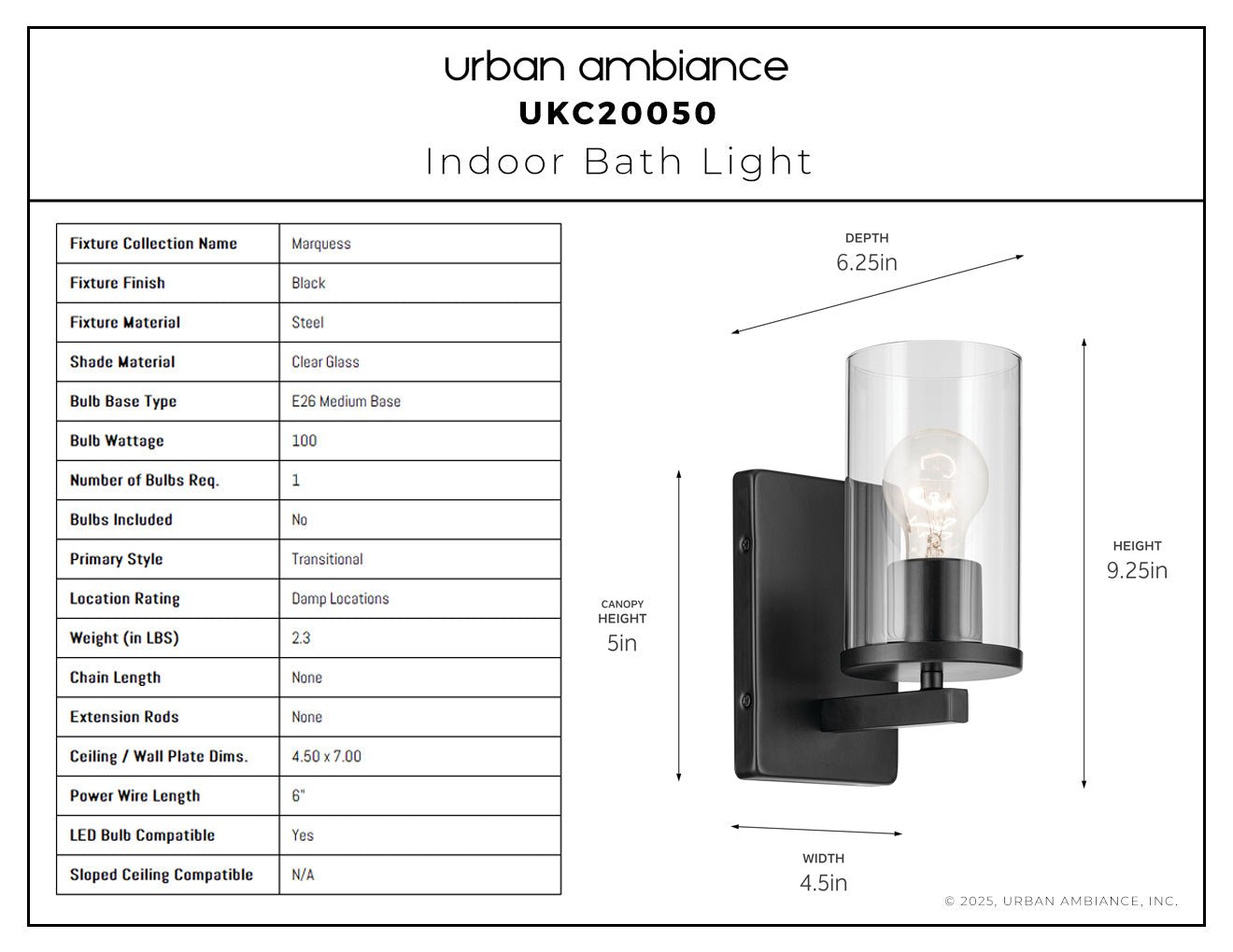 UKC20050 Transitional Indoor Bath Light, 9.25''H x 4.5''W x 6.25''Dep, Black Finish, Marquess Collection