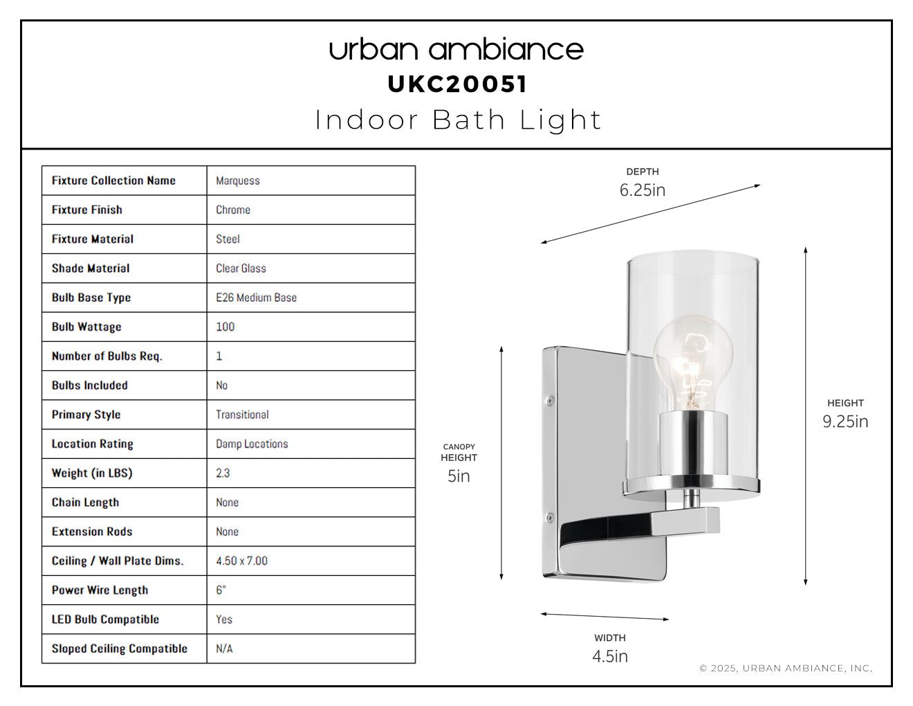 UKC20051 Transitional Indoor Bath Light, 9.25''H x 4.5''W x 6.25''Dep, Chrome Finish, Marquess Collection